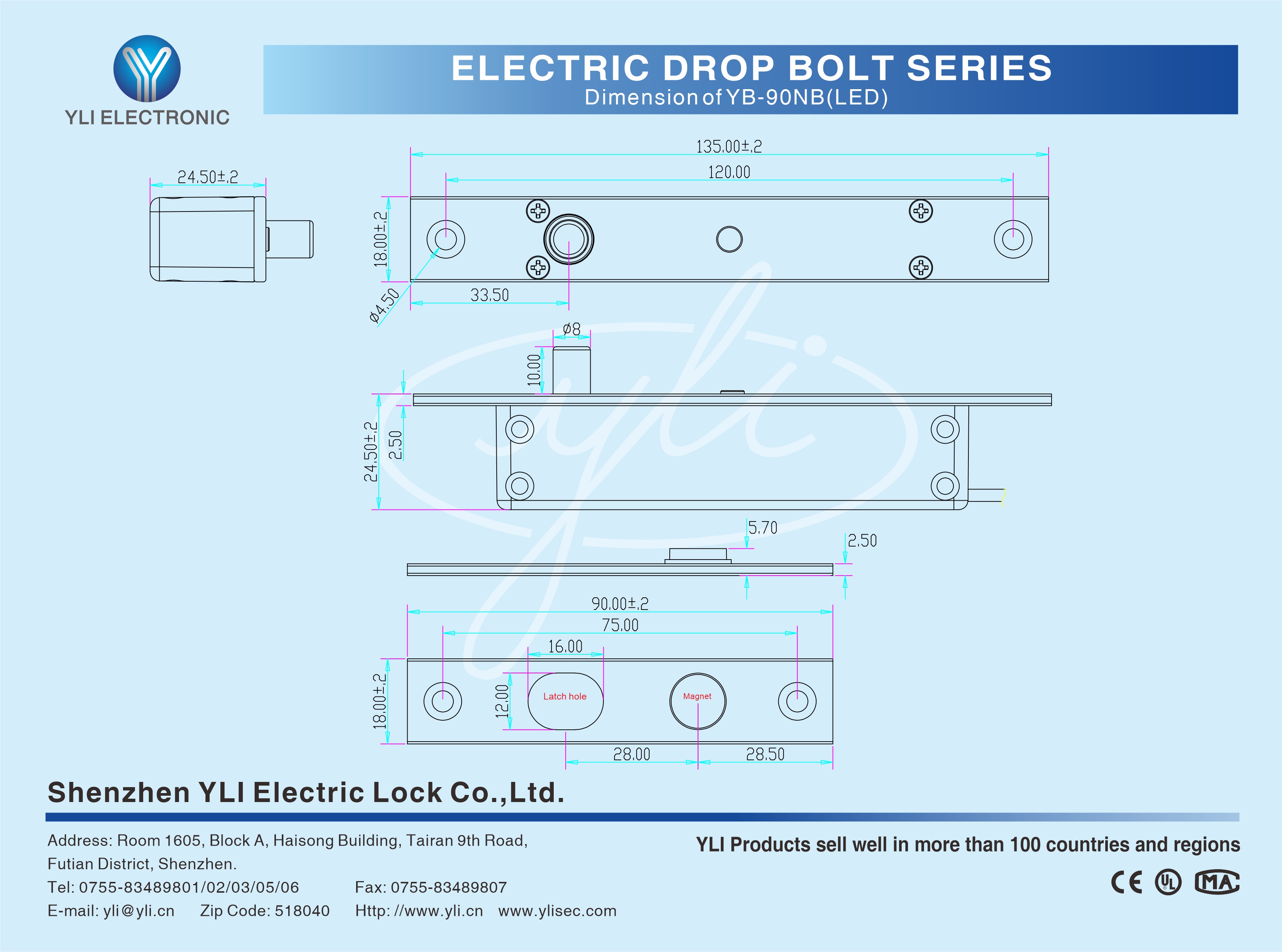 YB-90NB(LED) is an Mini Electric Bolt,which is manufactured by 304 type of stainless steel with special design.The linkage,manufactured by lathe,can withstand 500kg holding force.The special design of all-metal linkage parts results it can bear with the temperature of 60 ℃ or?-20 ℃ below zero,it pass through security test after it has been used for over 1 million times