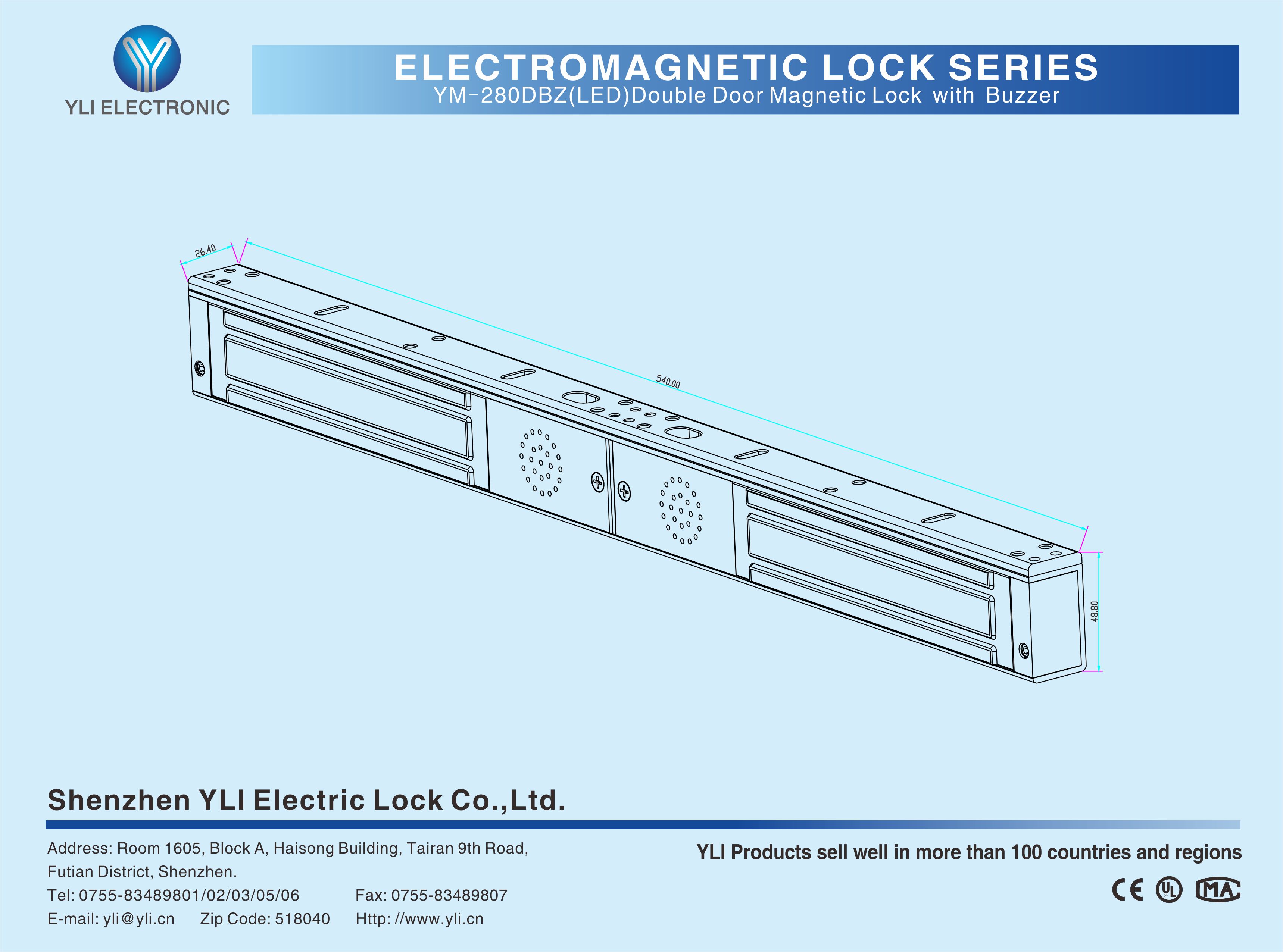 YM-280DBZ(LED) Double door magnetic lock is designed for wooden door, metal door, glass door and fireproof door. lt is equipped with a set of buzzer alarm.The internal buzzer alarm will sound until the door is closed if the lock is not closed within the set time (0-20 seconds). There is a set of lock status signal (NO/NC/COM) output contacts, which provides real-time feedback for the access control system.The lock body is equipped with a large LED light. The green light indicates unlocking, and the red light indicates locking. YLl magnetic lock cores are produced with robotic laser welding technology, providing 2 to 3 times stronger impact resistance and torsional resistance than conventional production processes, The surface is treated with the internationally leading electroplating process and the lock itself has passed the 240-hour salt spray test in the national laboratory, achieving excellent performance of anti-oxidation, anti-rust and anti-corrosion. Our company offers a complete range of brackets for different locks.