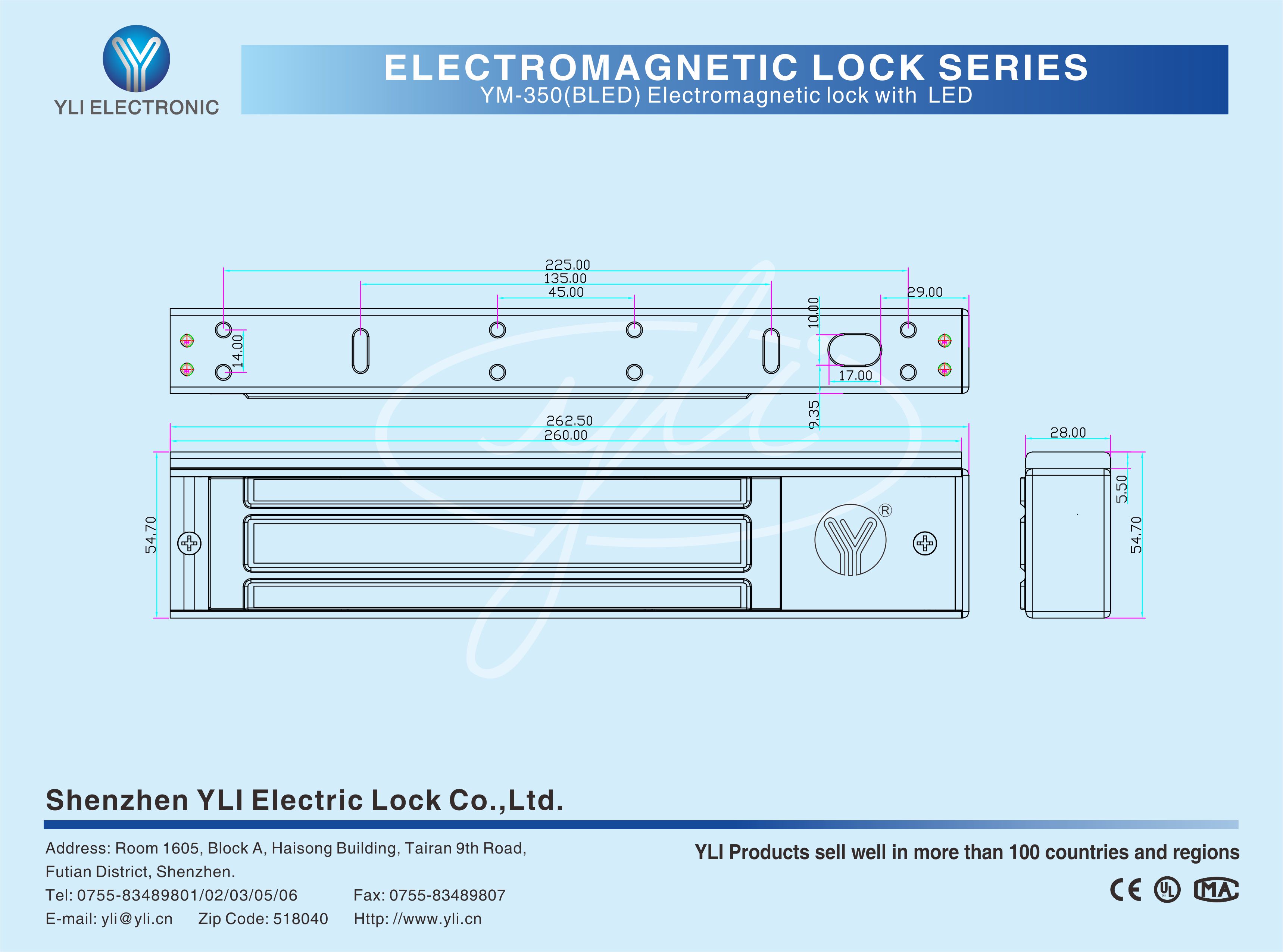 YM-350(BLED) Single door magnetic lock is designed for wooden door, metal door, glass door and fireproof door. There is a set of lock status signal (NO/NC/COM) output contacts. The lock body is equipped with a large LED light, The green light indicates unlocking, and the red light indicates locking. YLl magnetic lock cores are produced with robotic laser welding technology, providing 2 to 3 times stronger impact resistance and torsional resistance than conventional production processes. The surface is treated with the internationally leading electroplating process and the lock itself has passed the 240-hour salt spray test in the national laboratory, achieving excellent performance of anti-oxidation, anti-rust and anti-corrosion. Our company offers a complete range of brackets for different locks.