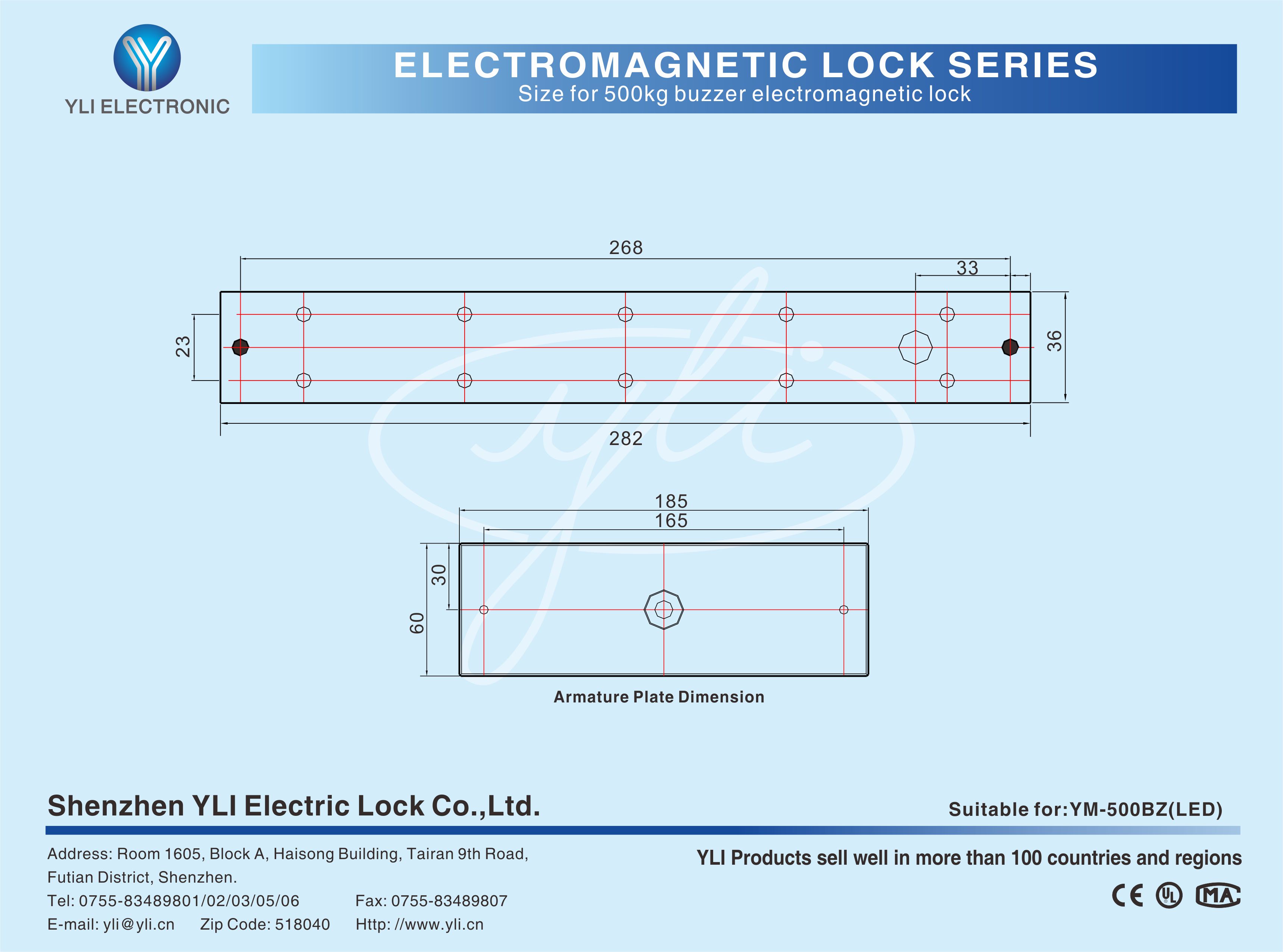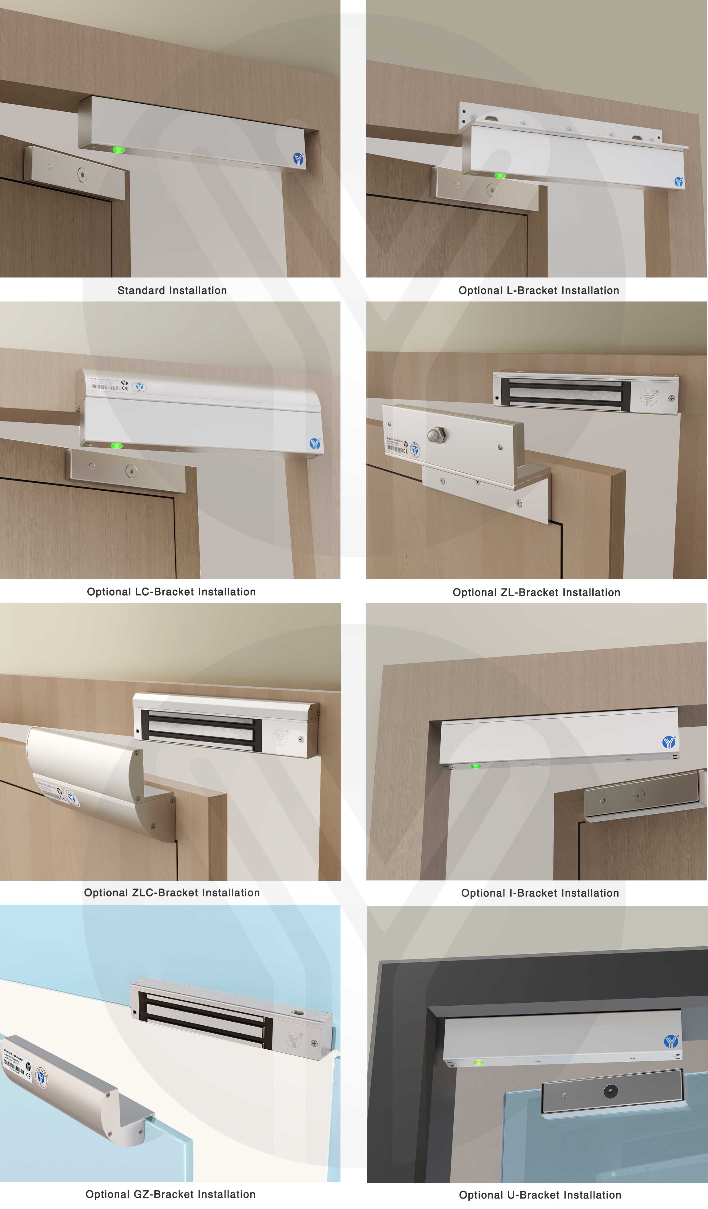 YM-500N(LED) Single door magnetic lock is designed for wooden door, metal door, glass door and fireproof door. There is a set of lock status signal (NO/NC/COM) output contacts. The lock body is equipped with a large LED light . The green light indicates unlocking , and the red light indicates locking. YLl magnetic lock cores are produced with robotic laser welding technology, providing 2 to 3 times stronger impact resistance and torsional resistance than conventional production processes . The surface is treated with the internationally leading electroplating process and the lock itself has passed the 240-hour salt spray test in the national laboratory, achieving excellent performance of anti-oxidation, anti-rust and anti-corrosion. Our company offers a complete range of brackets for different locks.