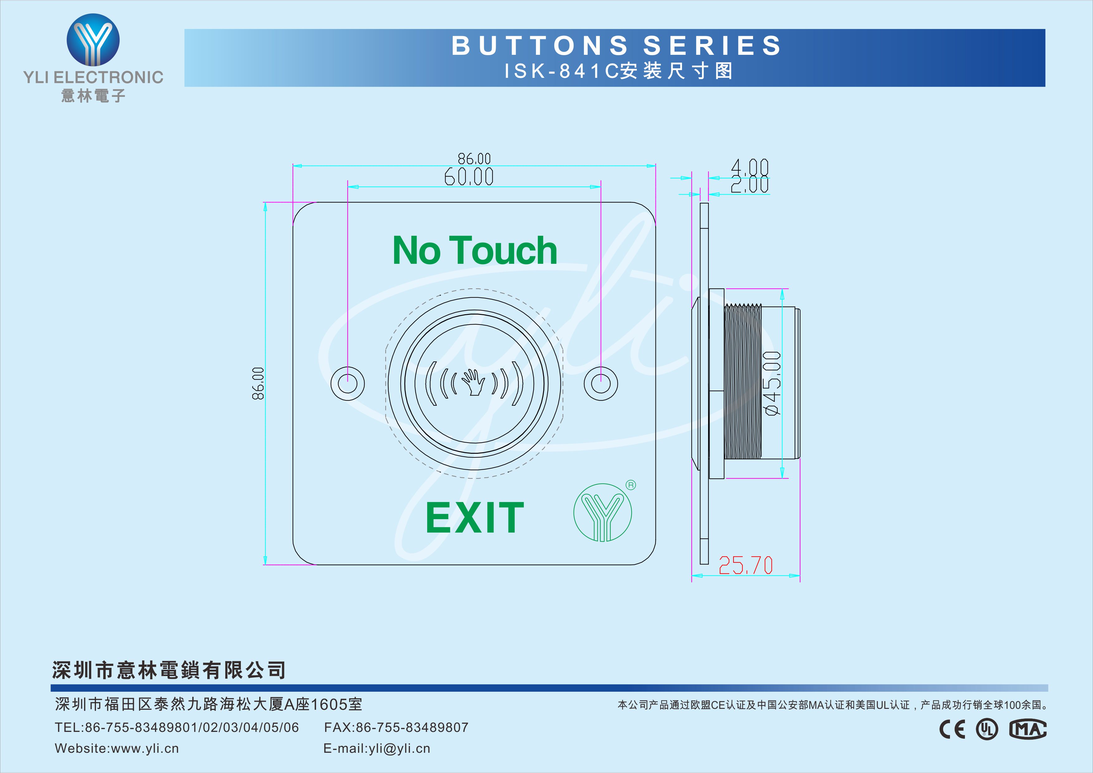 ISK-841C(LED) 是一款紅外感應門禁開關, 具有延時可調功能及紅外感應功能,感應距離4-12cm可調。LED燈顯示: 紅色待機狀態; 綠色動作狀態。采用304不銹鋼拉絲工藝處理,耐磨抗沖擊,堅固耐用。適用于智能樓宇、住宅小區、辦公樓、酒店、醫院、體育館等場所使用。